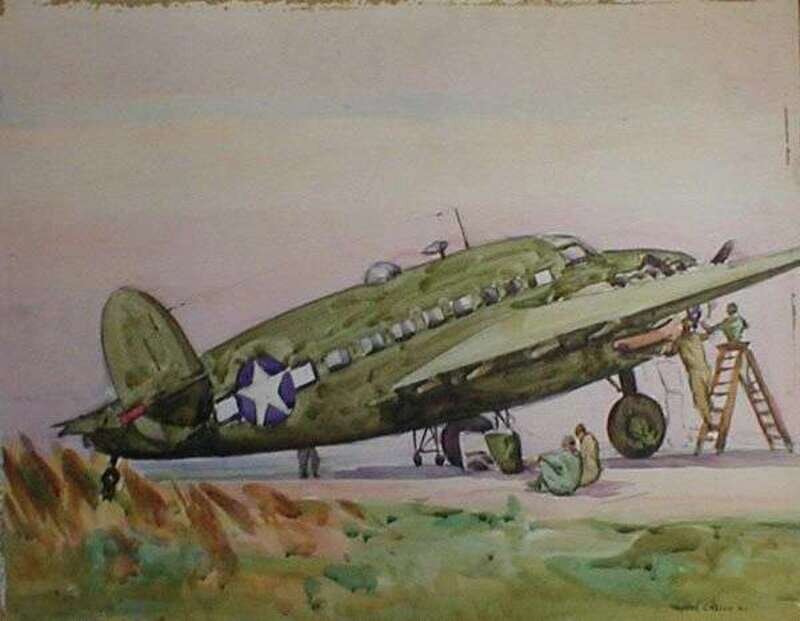 Watercolor on board, depicting a troop carrier being worked on by mechanics against a reddish sky, signed and dated lower right, 18.5 x 23.5 in.