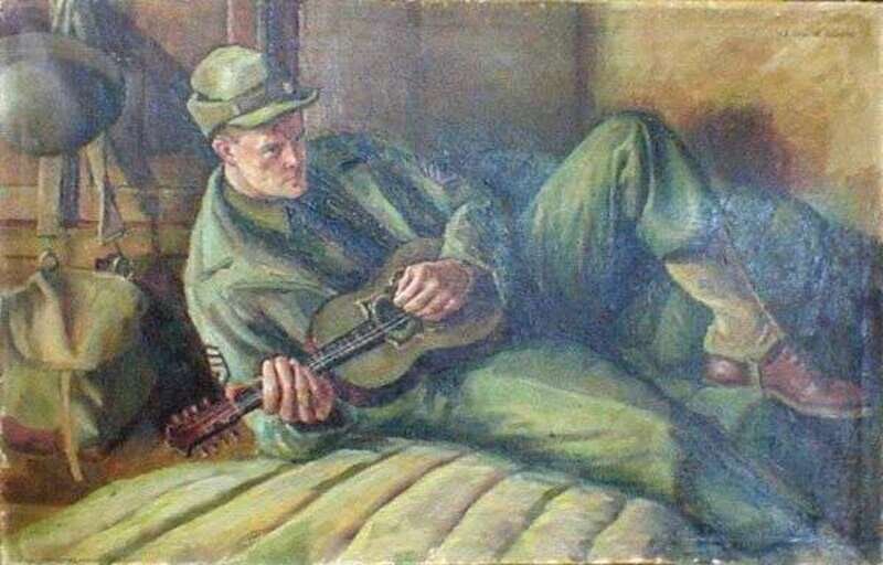Oil on canvas, with a relaxed American sergeant posed on a bunk strumming a guitar, his helmet and gas mask bag hanging on the wall, signed upper right, titled and inscribed on reverse, 20 x 30 in.