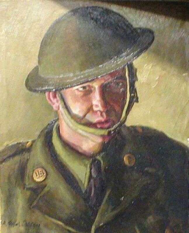 Oil on board, of a menacing-looking American serviceman in dress uniform and wearing helmet, signed lower left, inscribed on reverse, 12 x 14.5 in.