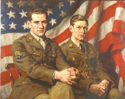 Oil on canvas, with two American servicemen posed seated in front of the flag, each wearing A-1 dress uniform, signed lower right and inscribed on back, 32 x 40.5 in.