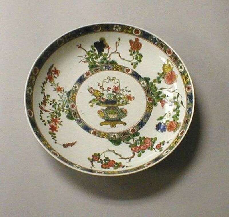 Each of shallow hemispherical form with central famille verte basket of flowers design surrounded by a patterned ring from which issue four different floral groups, another patterned ring at the edge, minimal surface abrasions and enamel wear, dia: 10.5 in.
