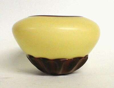 Of patra form and opaque yellow glass with translucent red glass, leafy base, h: 4 in.