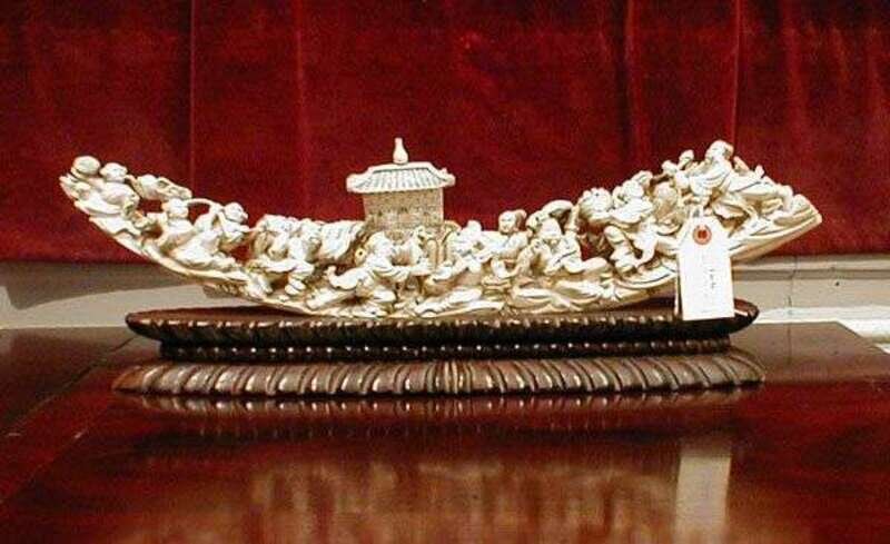 In the form of a sampan filled with eleven figures in a festive atmosphere. Including a carved teakwood stand. l: 20.75 in.