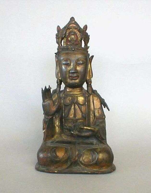 Seated dhyanasana, one hand vitarkamudra, the other with a bowl or vase, the figure wears a five pointed crown, the image of Amitabha in the center, with trace red pigment and gilt, some damage to fingers, h: 12.5 in.