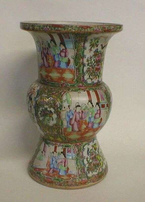 Yen-yen form with multiple rose mandarin style reserves against a gilt and scrollwork ground, haircrack to foot, mouth rim repaired, h: 13.5 in.