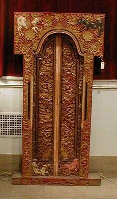 Relief carved and painted in polychromy and gilt with flowers, swirls, winged lions and bulls, h: 74 in., width at top: 37 in., d: 5 in.
