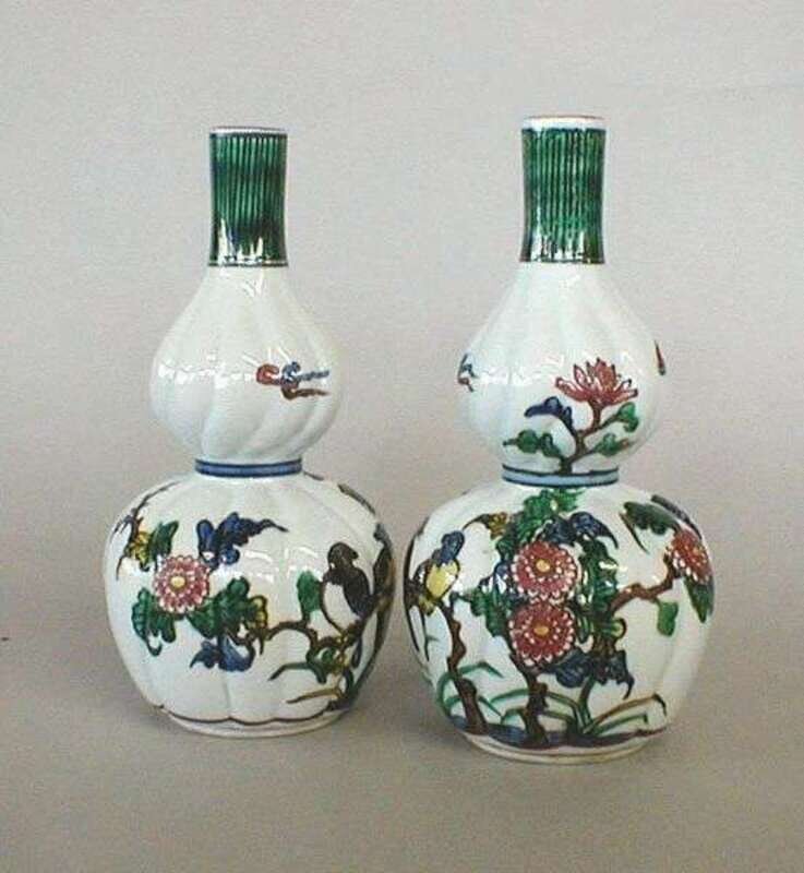 Each of lobed double gourd shape with green, red, blue, yellow and brown bird and flower decoration, h: 7.25 in.