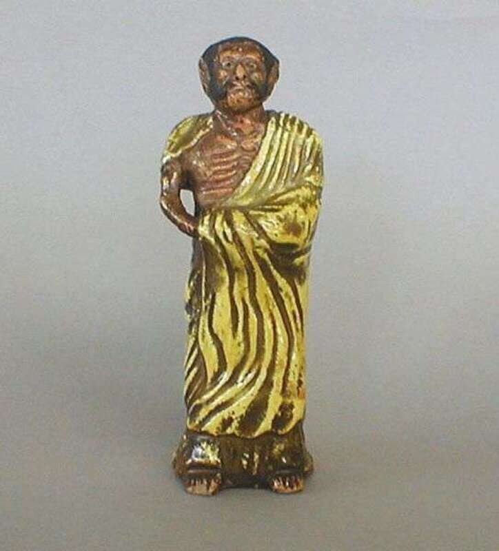 Perhaps Vajraputra, the figure stands with thick black hair and moustache, exposed ribs and yellow robe, his skin an orangey hue, minimal chips, h: 7.75 in.
