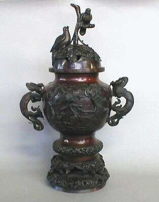 Of globular form on triple tiered base with pierced domical lid with bird on a branch knop, the body with twin applied dragon handles and high relief design of birds on branches, repairs, losses h: 20.75 in.