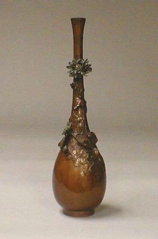 Of bottle form with ovoid body and tall slender neck with flaring mouth and expertly cast applied blossoms meandeing upward, rich orange/brown patina, h: 18 in.