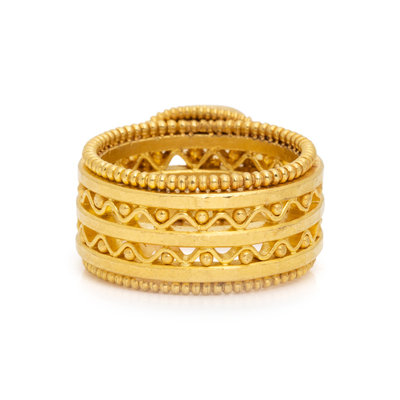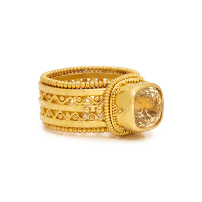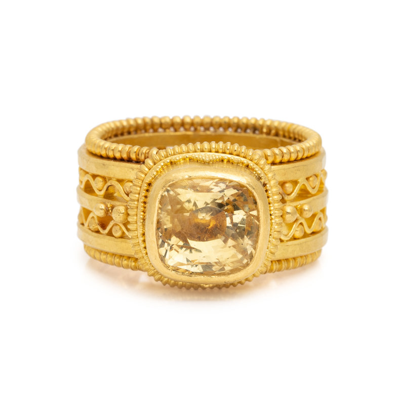 Consisting of a ring with wirework and granulation detail, containing one cushion mixed cut yellow sapphire measuring approximately 9.80 x 9.30 x 7.80 mm. Ring size 9.