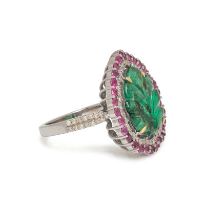 Containing one leaf carved emerald measuring approximately 15.05 x 12.70 mm, numerous round mixed cut rubies and numerous single cut diamonds. Mounted in silver. Ring size 7 1/4.