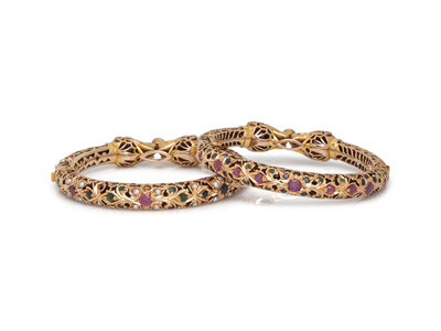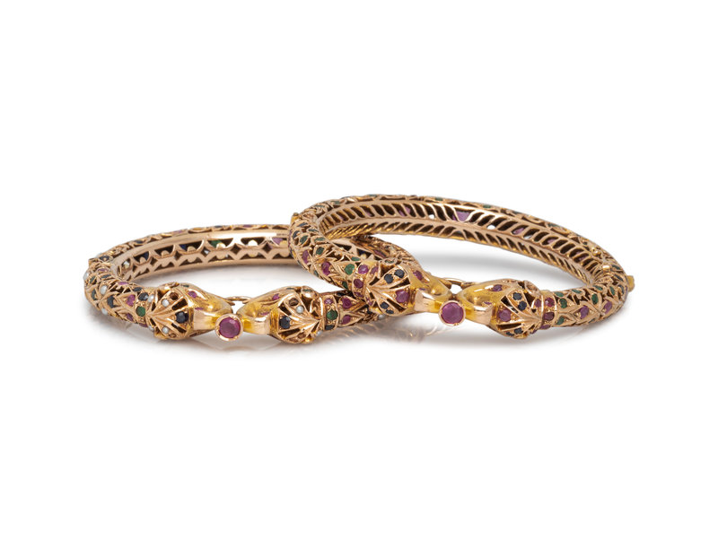 Consisting of two elephant motif bangles containing numerous round mixed cut sapphires, emeralds and rubies and numerous seed pearls, hinged with side clasps. 6 1/2 inches inner circumference.