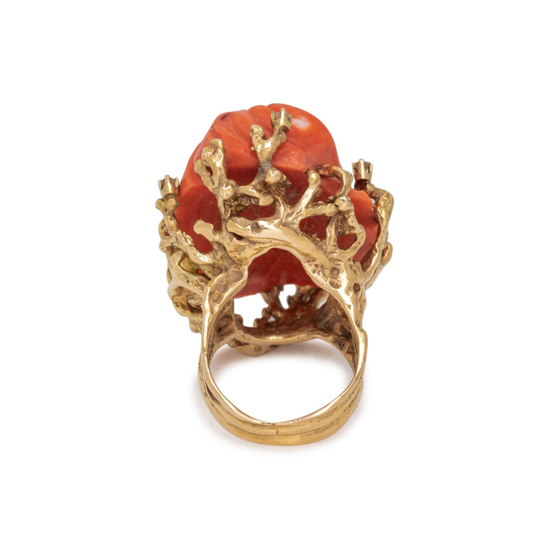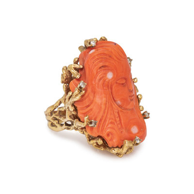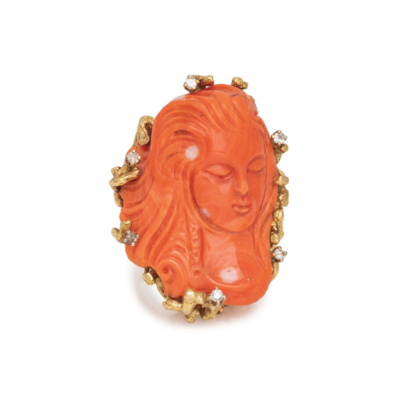 Containing one carved coral depicting a woman and six round brilliant cut diamonds. Mounted in yellow gold. Ring size 7.