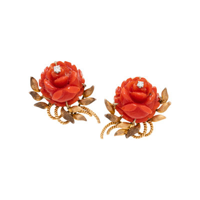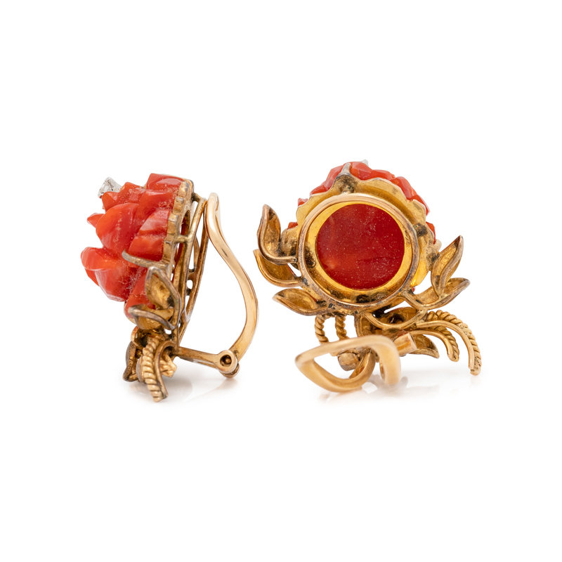 Containing two carved coral flowers and two single cut diamonds. Mounted in yellow gold. 3/4 inch long.