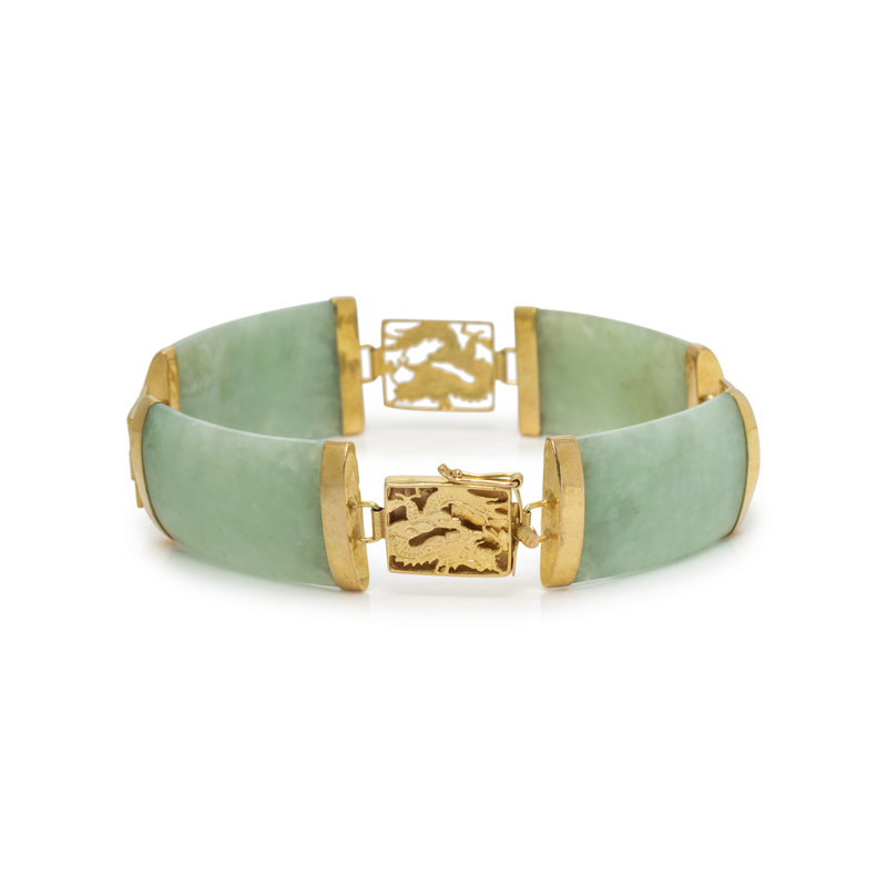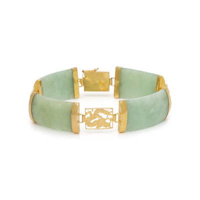 Containing four jade plaques with yellow gold dragon link spacers. 7 1/4 inches long.