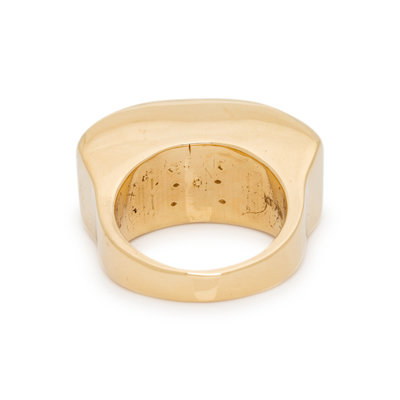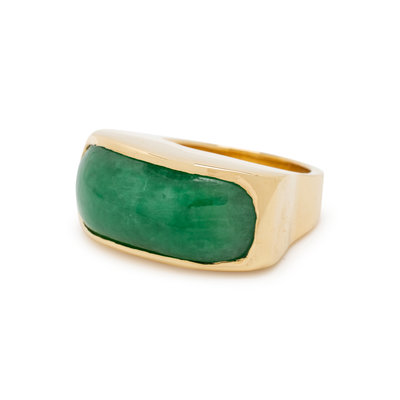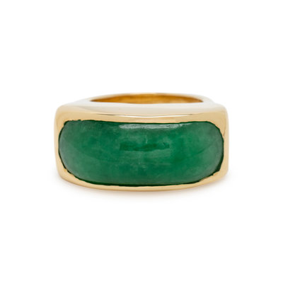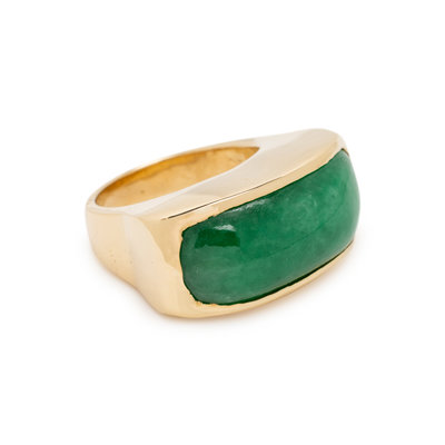 Containing one curved jade plaque measuring approximately 30.00 x 12.00 mm. Ring size 10 3/4.
