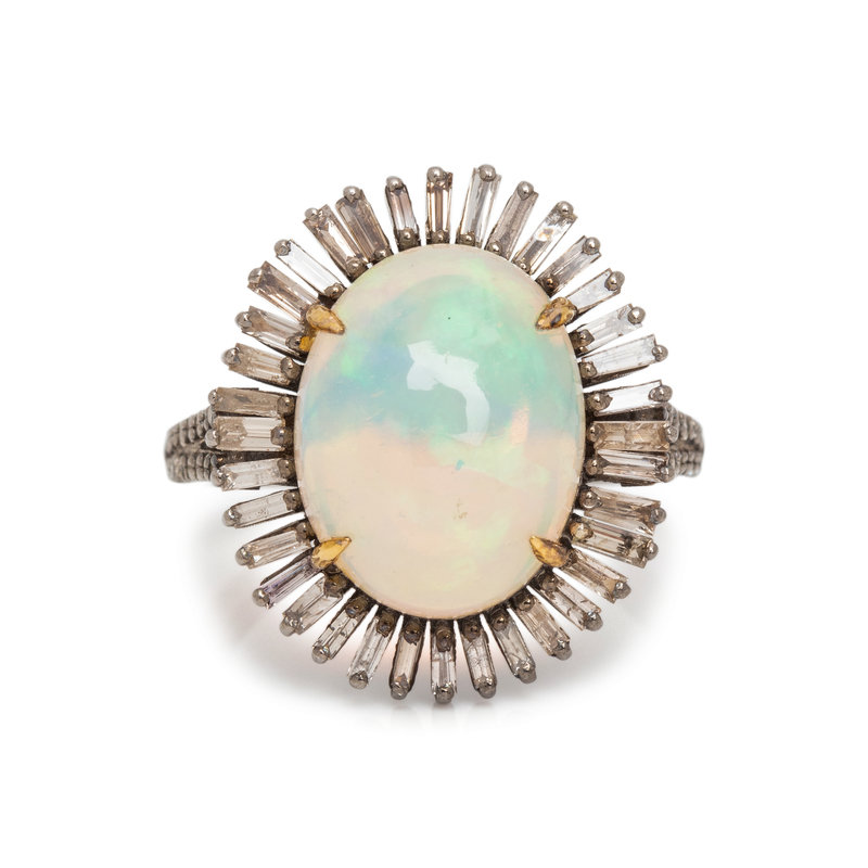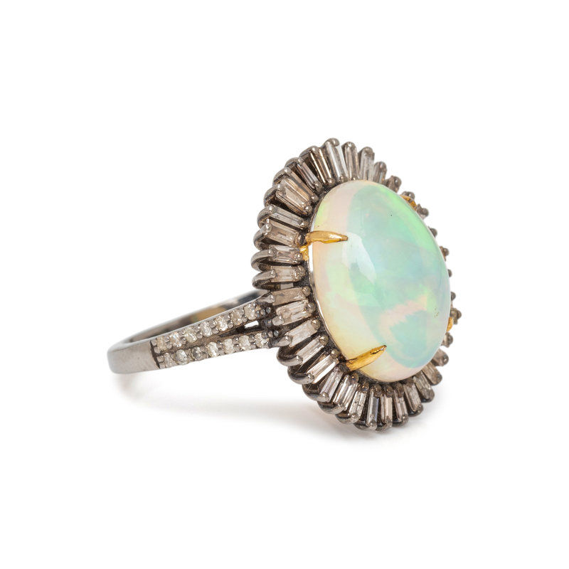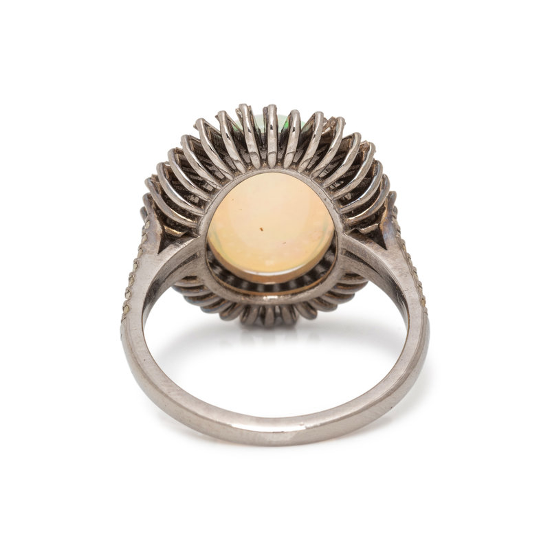 Containing one oval cabochon opal measuring approximately 13.90 x 10.80 mm and numerous baguette and single cut diamonds weighing approximately 1.10 carats total. Mounted in silver. Ring size 7 1/4.
