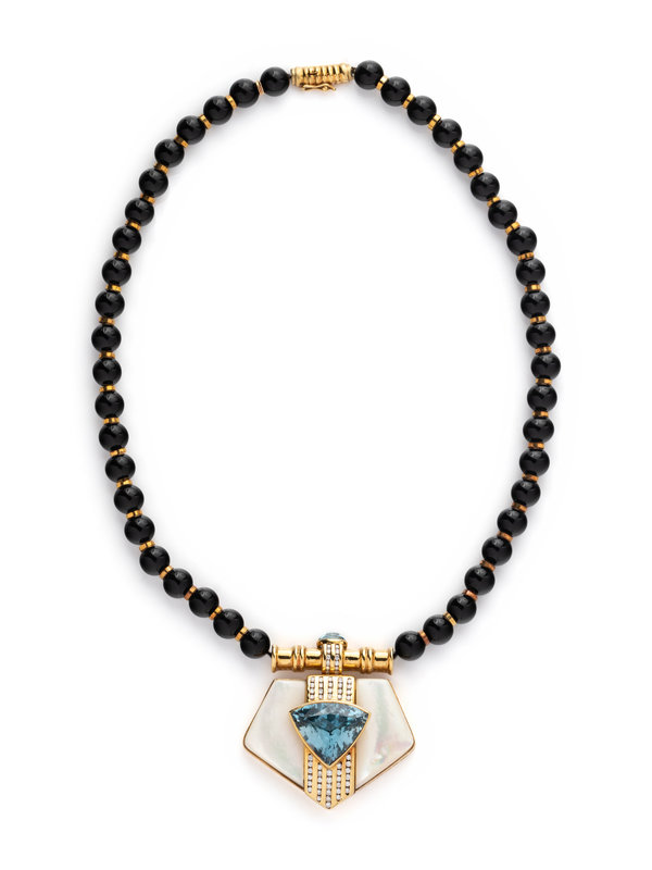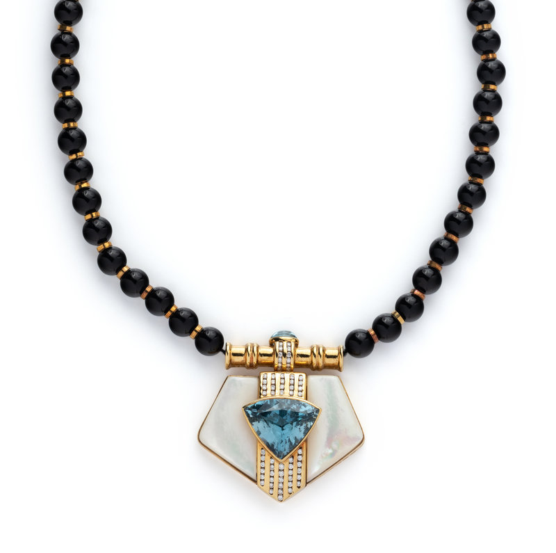 Consisting of an onyx bead necklace with yellow gold spacers and clasp, the pendant containing one triangular mixed cut blue topaz, one oval cabochon blue topaz, two mother-of-pearl plaques and 62 round brilliant cut diamonds weighing approximately 1.00 carat total. 18 inches long.