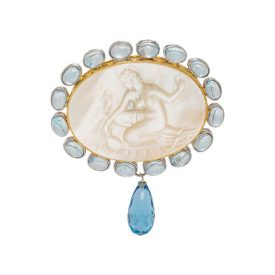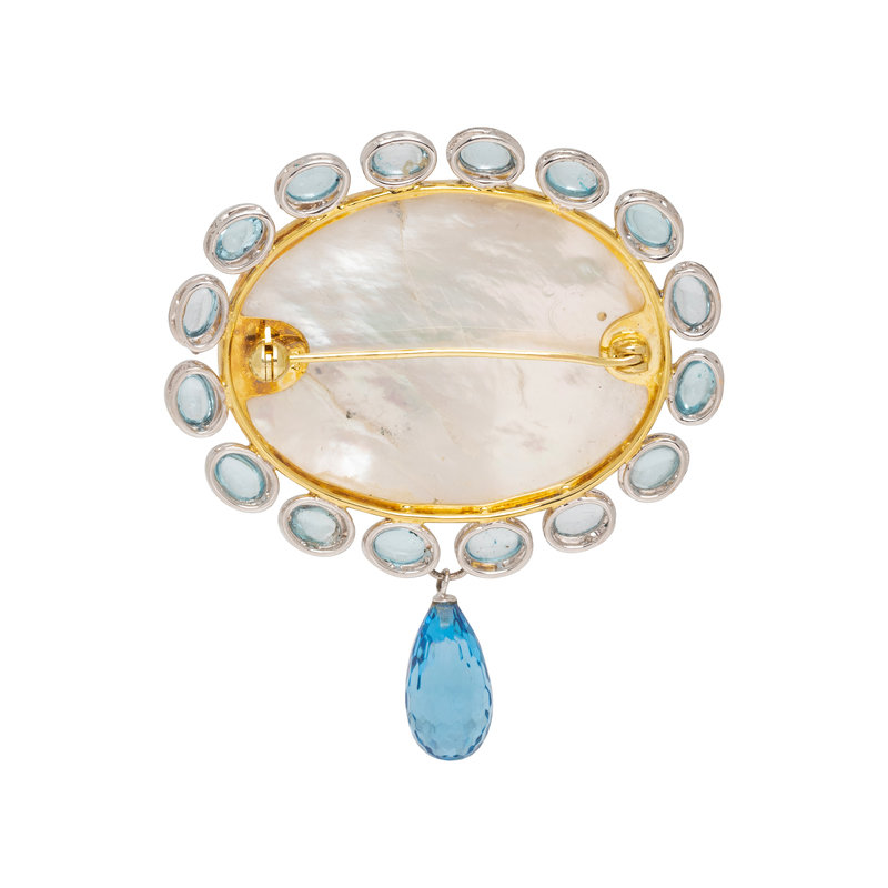 Containing one oval carved mother-of-pearl cameo depicting a woman with a water jug, 16 oval blue topaz cabochons and one blue glass briolette. Mounted in bicolor gold. 2 1/4 x 2 inches.