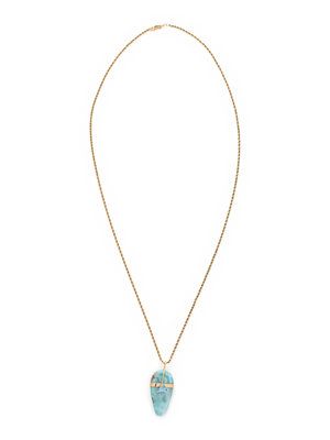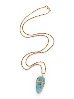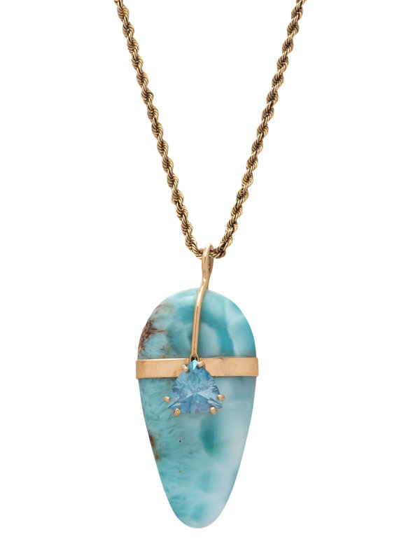 Consisting of a pendant containing one pear larimar cabochon measuring approximately 36.00 x 18.00 mm and one triangular mixed cut aquamarine, suspended from a rope chain necklace. 24 inches long.