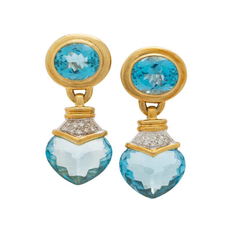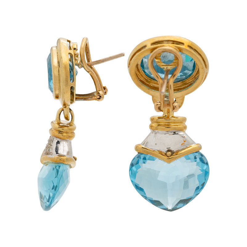 Containing two oval mixed cut blue topaz, two heart shaped blue topaz and 18 round brilliant cut diamonds weighing approximately 0.20 carat total, posts with clip backs. Mounted in bicolor gold. 1 5/8 inches long.