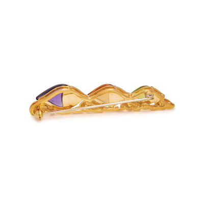 Consisting of three fish containing peridot, citrine and amethyst cabochons with diamond eyes. 2 1/4 inches x 1/2 inch.