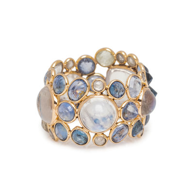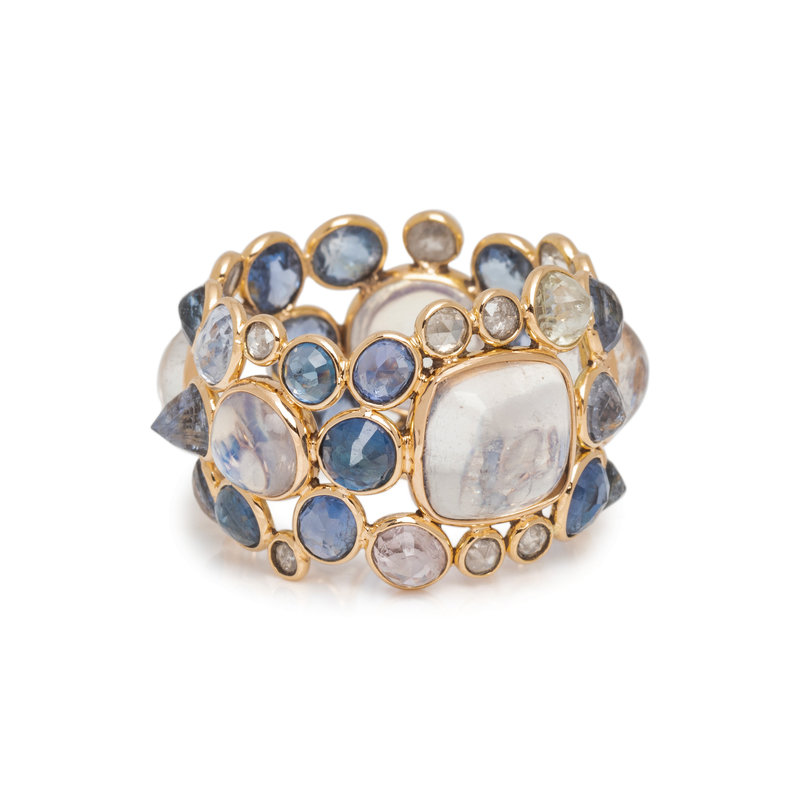 Containing five round and cushion cabochon moonstones, numerous round and mixed cut sapphires in various colors and 12 rose cut diamonds. Mounted in rose gold. Ring size 5.