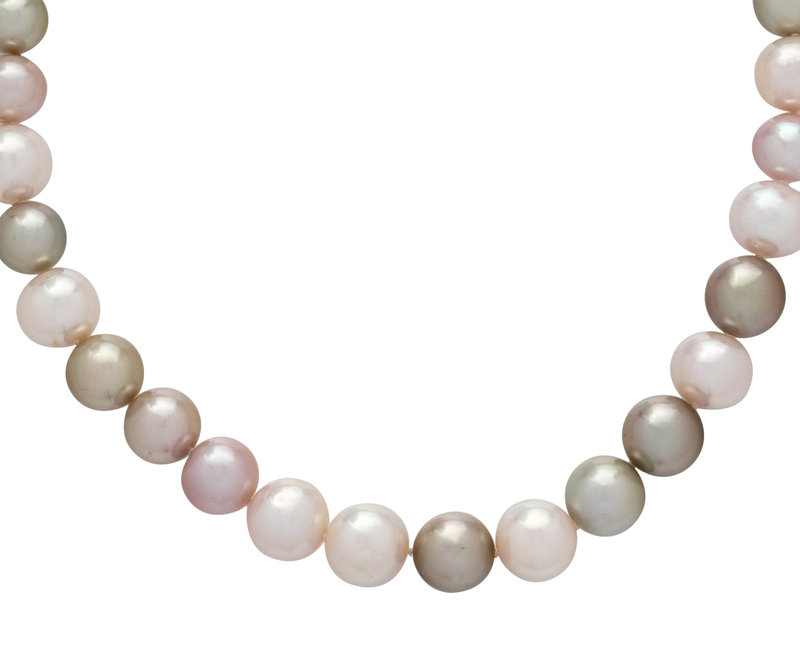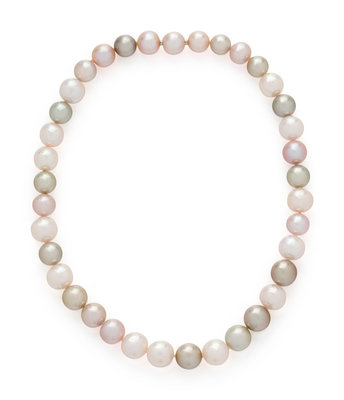 Containing various colored South Sea pearls measuring approximately 9.85-11.70 mm in diameter, strung knotted with a hidden clasp. 16 inches long.