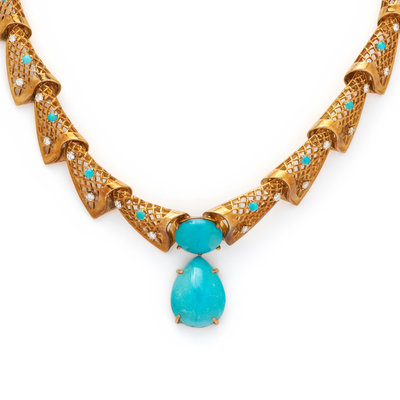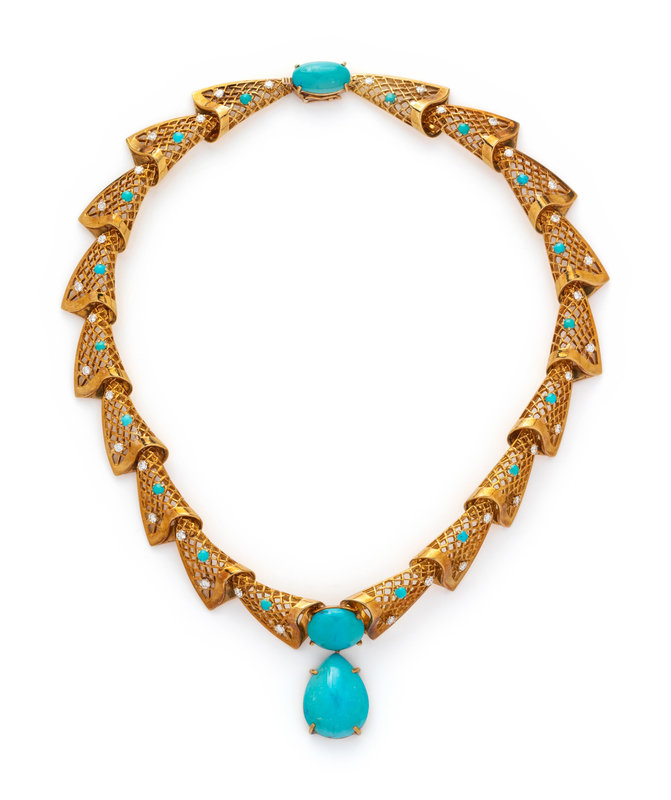 YELLOW GOLD, TREATED TURQUOISE AND DIAMOND NECKLACE