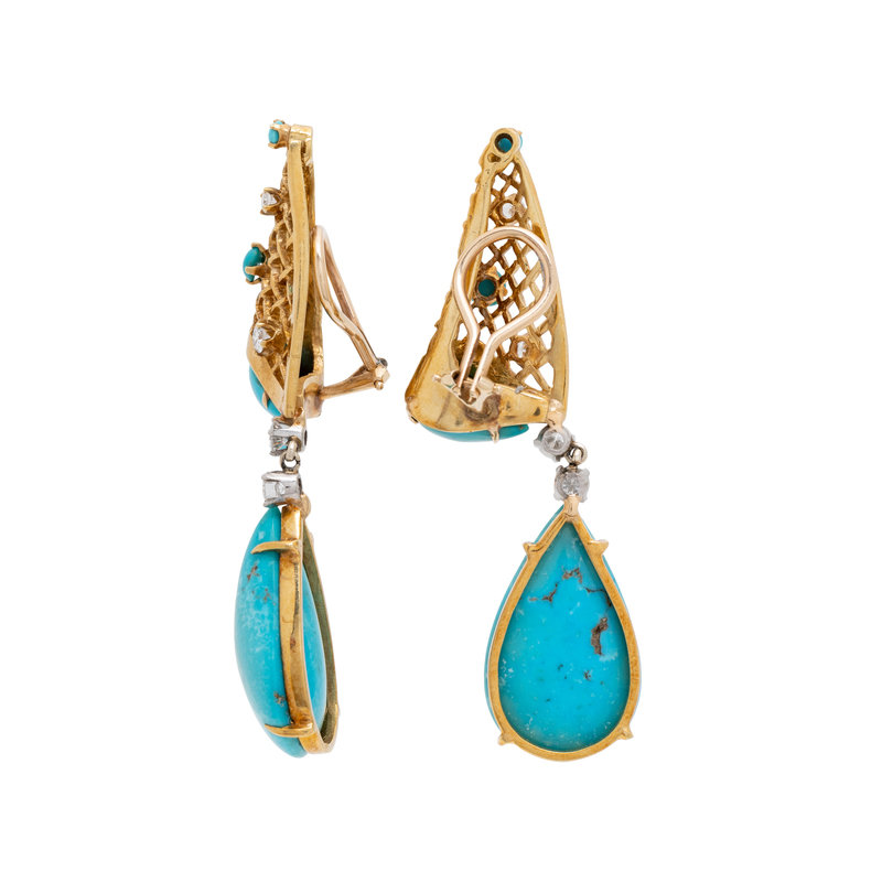 YELLOW GOLD, TREATED TURQUOISE AND DIAMOND EARCLIPS