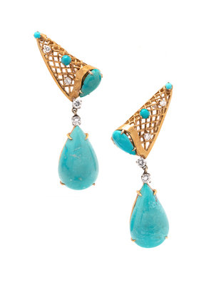 Containing four pear treated turquoise cabochons and eight round brilliant cut diamonds weighing approximately 0.85 carat total. 1 3/4 inches long.