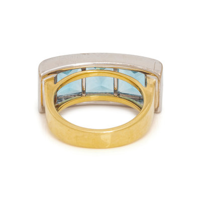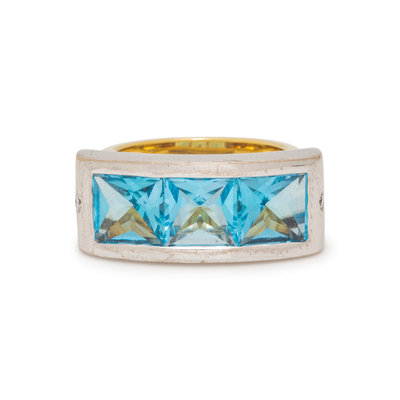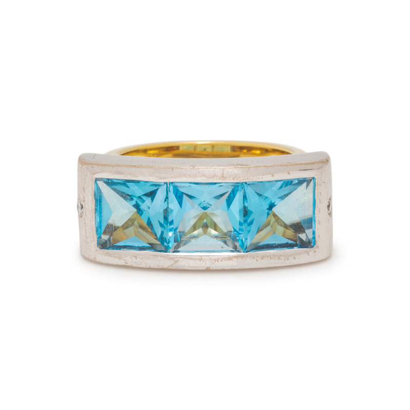 Containing three square mixed cut blue topaz measuring approximately 7.00 x 7.00 mm and two round brilliant cut diamonds. Ring size 6 1/2.