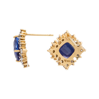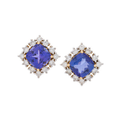 Containing two cushion mixed cut tanzanites measuring approximately 8.00 x 8.00 mm and 24 round brilliant cut diamonds weighing approximately 0.95 carat total. Mounted in bicolor gold. 5/8 inch long.