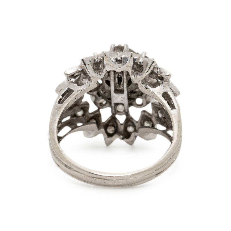 Containing one round cabochon star sapphire measuring approximately 7.30 mm in diameter and 24 round brilliant cut diamonds weighing approximately 1.00 carat total. Mounted in white gold. Ring size 8 3/4.