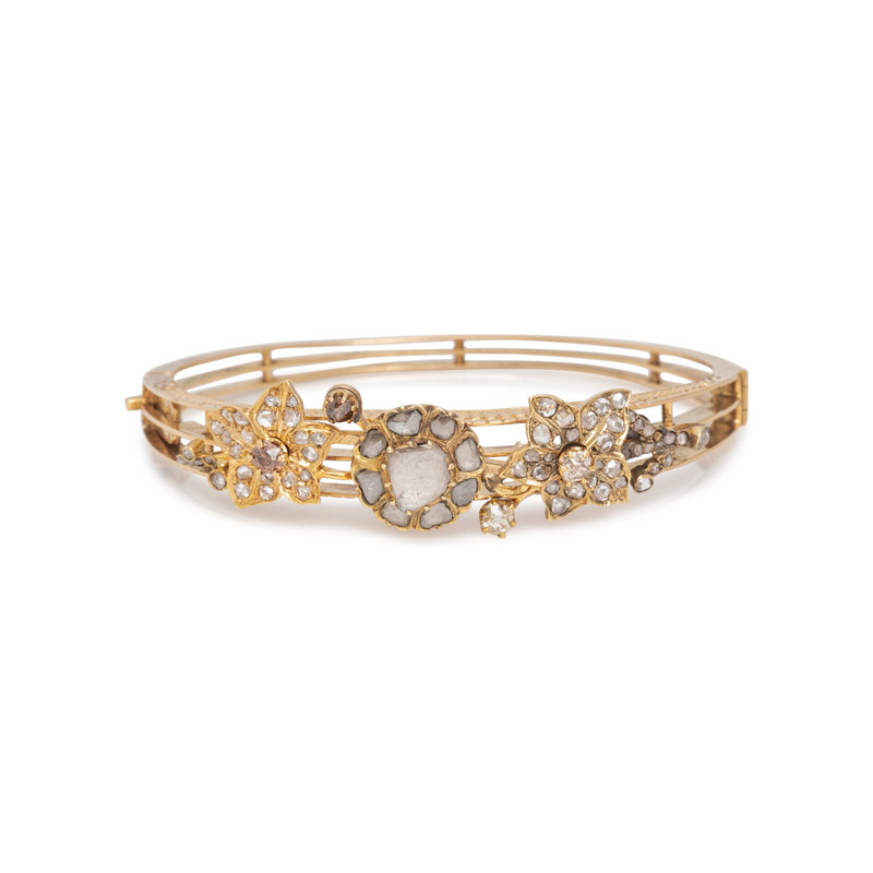 Containing numerous mixed cut diamonds and colored diamonds (origin of color not tested), hinged with side clasp. 6 1/4 inches inner circumference.