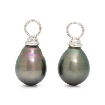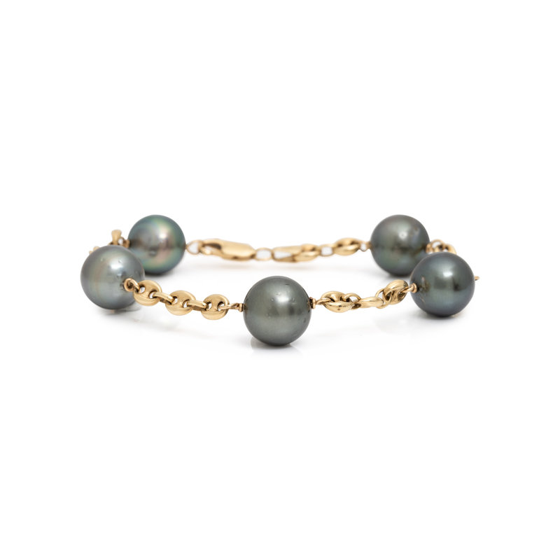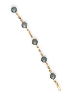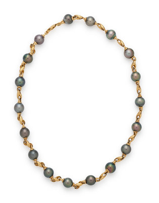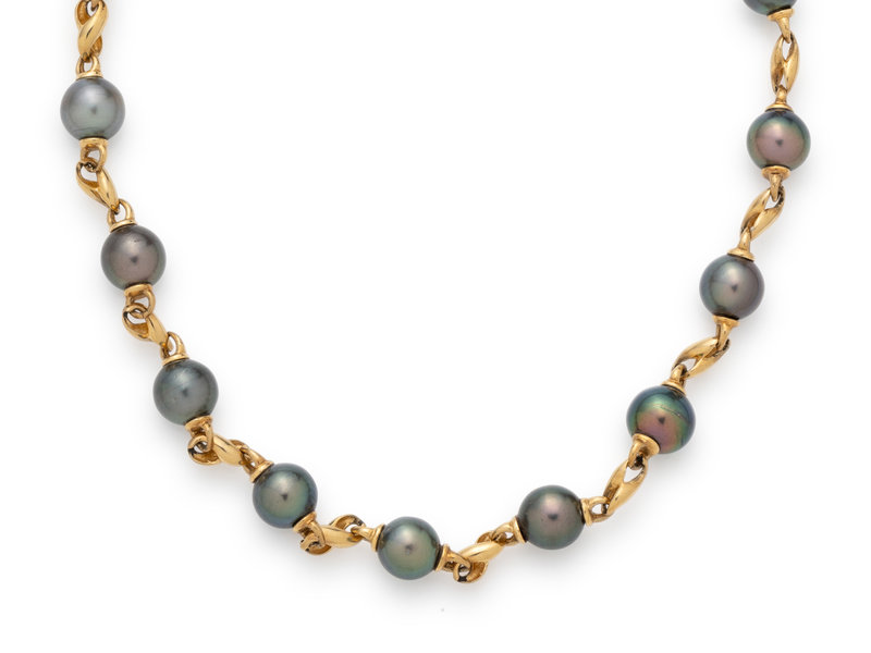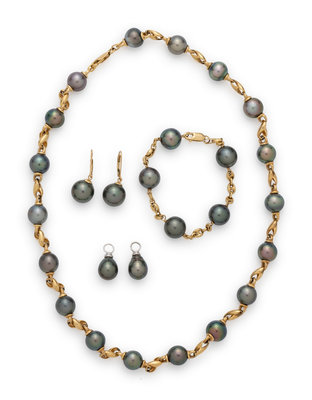 Consisting of a yellow gold necklace containing numerous Tahitian pearls, a yellow gold bracelet containing five Tahitian pearls, a pair of yellow gold drop earrings containing two Tahitian pearls, together with a pair of white gold earring attachments containing two Tahitian pearl drops. Necklace: 20 inches long. Bracelet: 7 3/4 inches long. Earrings: 1 1/4 inches long. Earring attachments: 3/4 inch long.