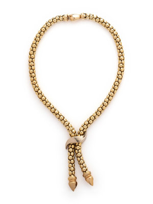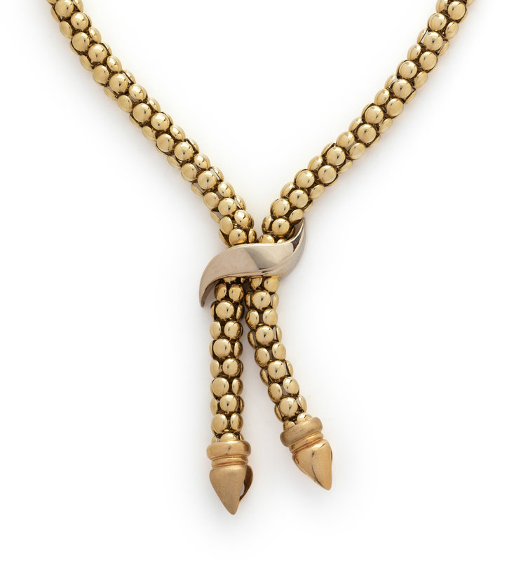 Consisting of a popcorn mesh link lariat style necklace with white gold connector. 18 inches long.