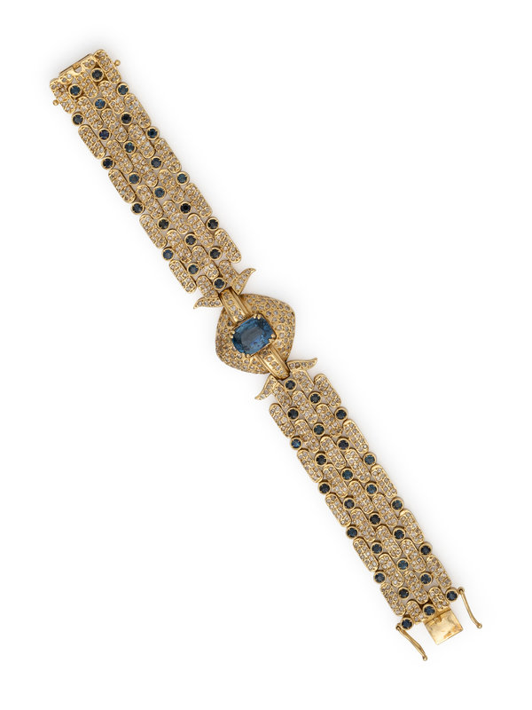 Containing one cushion mixed cut synthetic sapphire measuring approximately 11.10 x 8.55 mm, numerous round mixed cut sapphires and numerous round brilliant cut diamonds weighing approximately 7.00-8.00 carats total. Mounted in yellow gold. 7 inches long.