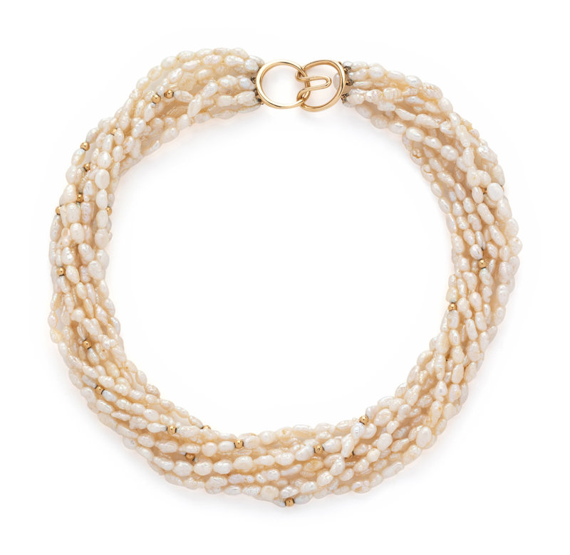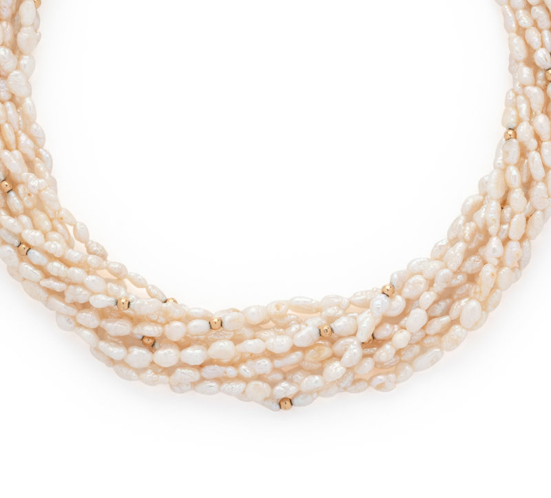 Consisting of 10 strands of keshi pearls interspersed with yellow gold beads, strung with a yellow gold clasp. 15-16 1/2 inches long.