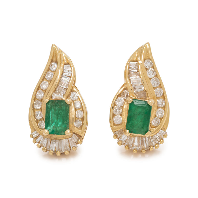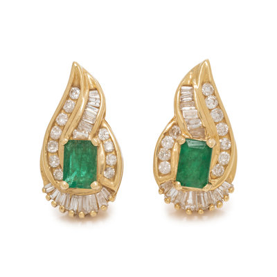 Containing two emerald cut emeralds, 30 tapered baguette and 22 round brilliant cut diamonds weighing approximately 0.95 carat total, posts with clip backs. Mounted in yellow gold. 3/4 inch long.