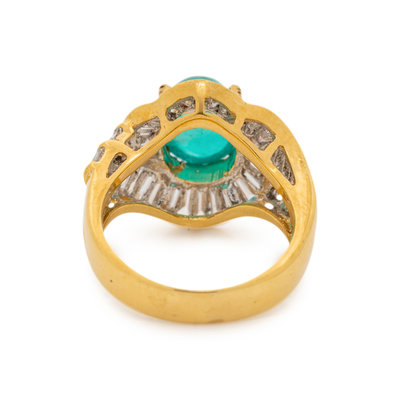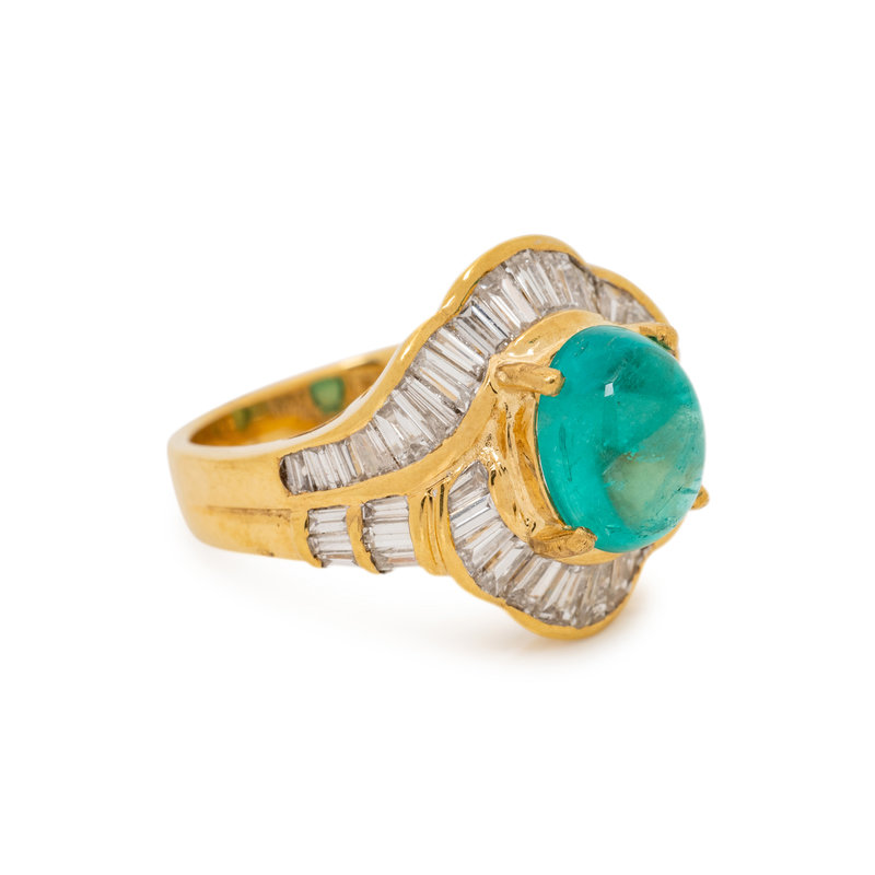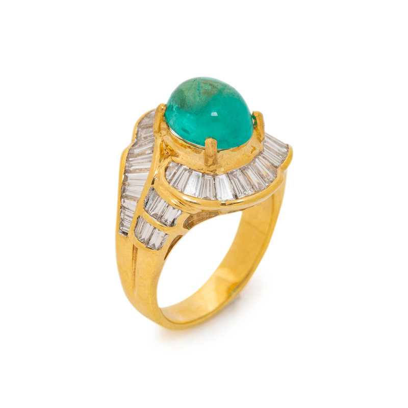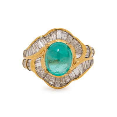 Containing one oval cabochon emerald measuring approximately 9.60 x 7.85 mm and 46 baguette cut diamonds weighing approximately 1.75 carats total. Mounted in yellow gold. Ring size 6 1/4.
