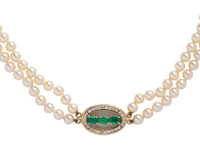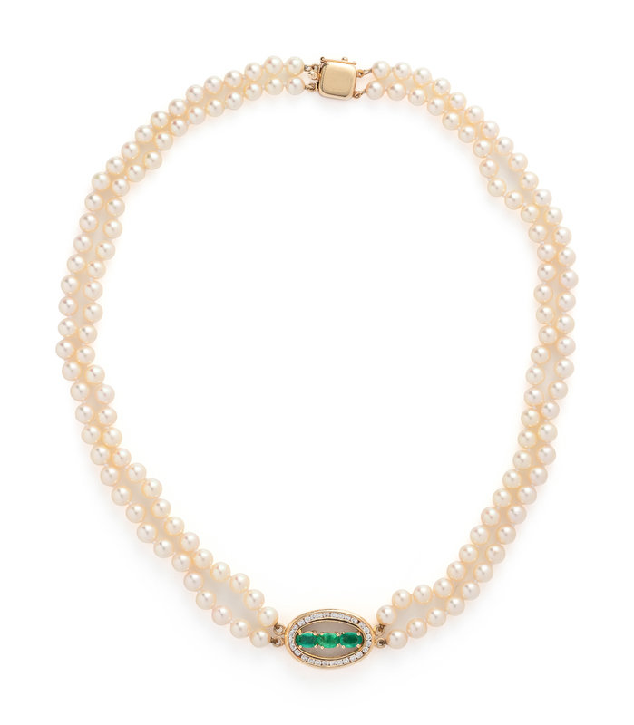 Consisting of two strands of pearls measuring approximately 5.25-5.40 mm in diameter, strung knotted with yellow gold clasp and central section containing three oval mixed cut emeralds and 28 round brilliant cut diamonds weighing approximately 0.50 carat total. 16 3/4 inches long.
