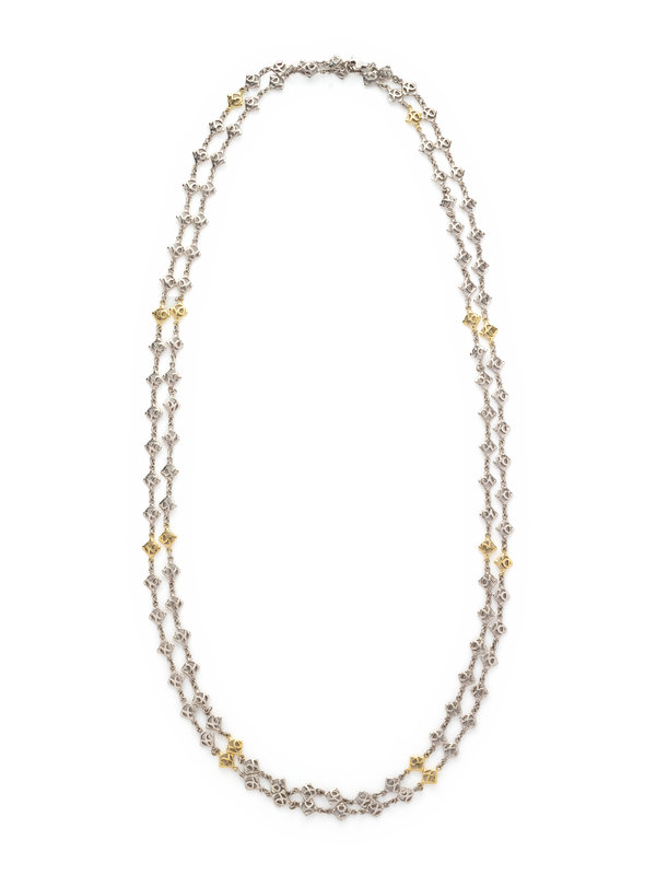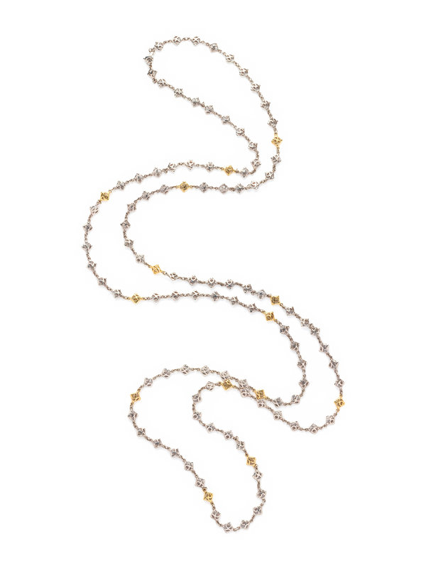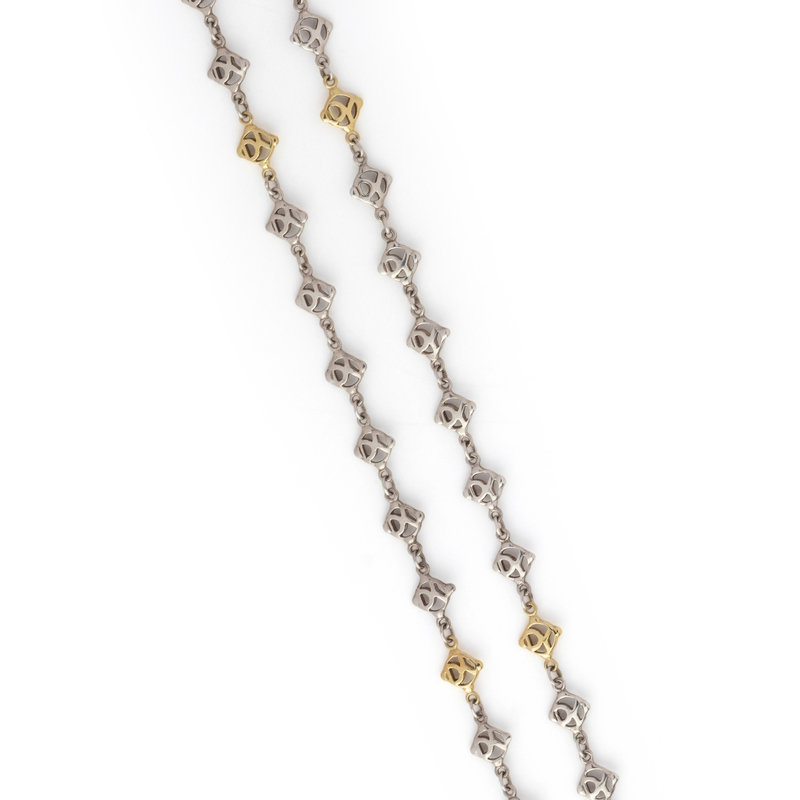 Consisting of sterling silver and yellow gold DY logo links. 70 inches long.