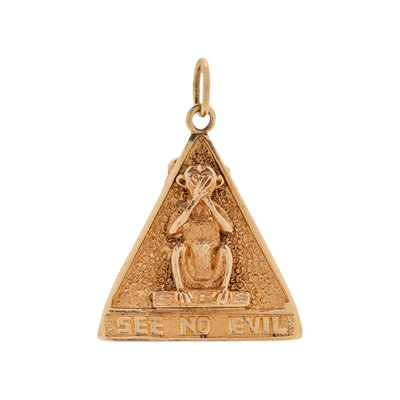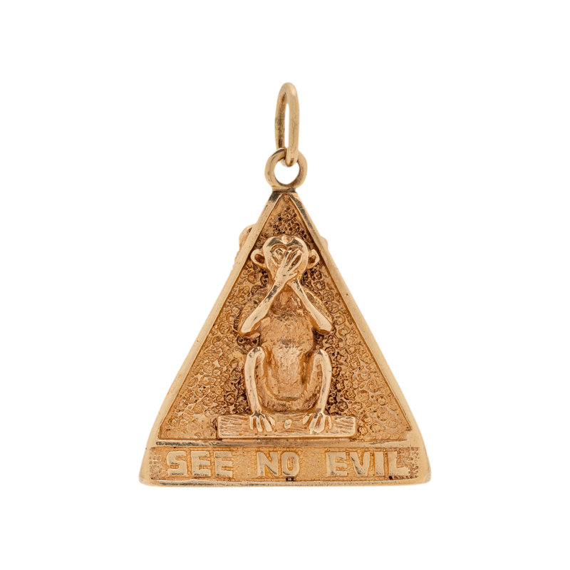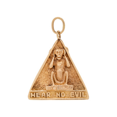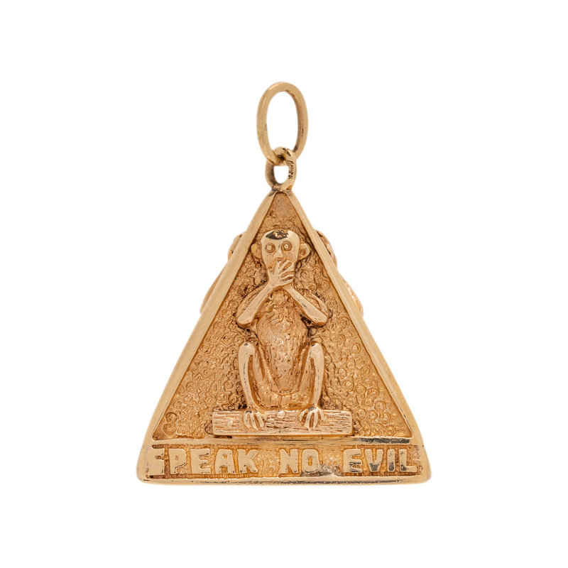 Consisting of a triangular charm with a monkey on each side depicting 'see no evil, speak no evil and hear no evil'. 1 1/8 inches long.