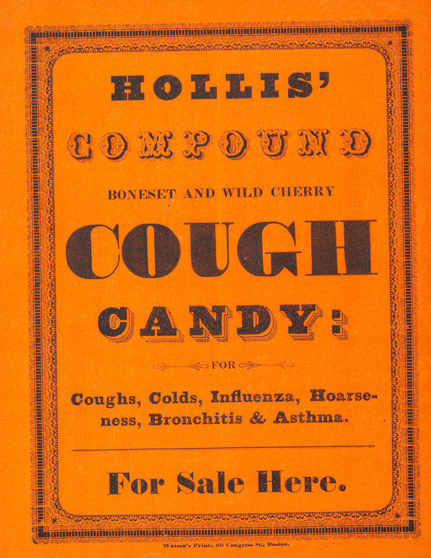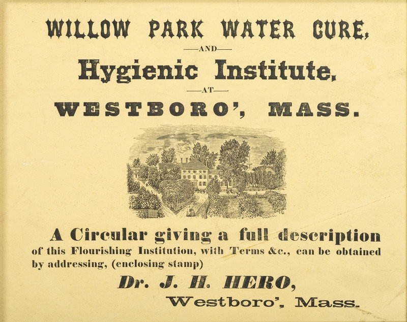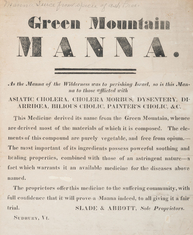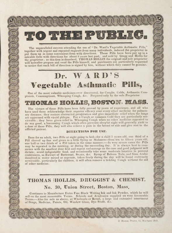 Willow Park Water Cure, and Hygienic Institute at Westboro, Mass. Westboro, MA: Dr. J.H. Hero, n.d. Visible 13 x 10 1/4 in. (some soil); framed to 14 1/2 x 12 1/4 in. -- Hollis Compound Boneset and Wild Cherry Cough Candy. Boston, MA: Watson's Print, n.d. 7 3/4 x 10 1/4 in.; framed to 10 1/2 x 13 1/4 in. -- To the Public...Dr. Ward's Vegetable Asthmatic Pills. Boston, MA: D. Hooton, n.d. 8 1/2 x 12 in. (light dampstain to lower left); framed to 12 x 15 in. -- Green Mountain Manna. Sudbury, VT: Slade & Abbott, n.d. 8 x 10 in. (light toning, occasional brown spotting); framed to 10 1/4 x 13 in. -- Together, 4 letterpress broadsides, not examined out of frames.