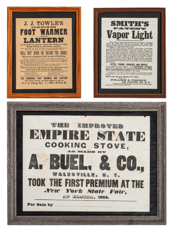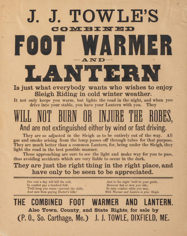 [Also with:] J.J. Towle's Combined Foot Warmer and Lantern. [Dixfield, ME]: N.p., ca 1883. 9 1/2 x 12 in. printed broadside (toned); framed to 12 1/2 x 15 1/2 in. (not examined out of frame). Signed in type by J.J. Towle. The 8 February 1883 issue of the News & Citizen [Morrisville, Vermont] advertises that two local men have secured agency for the invention.