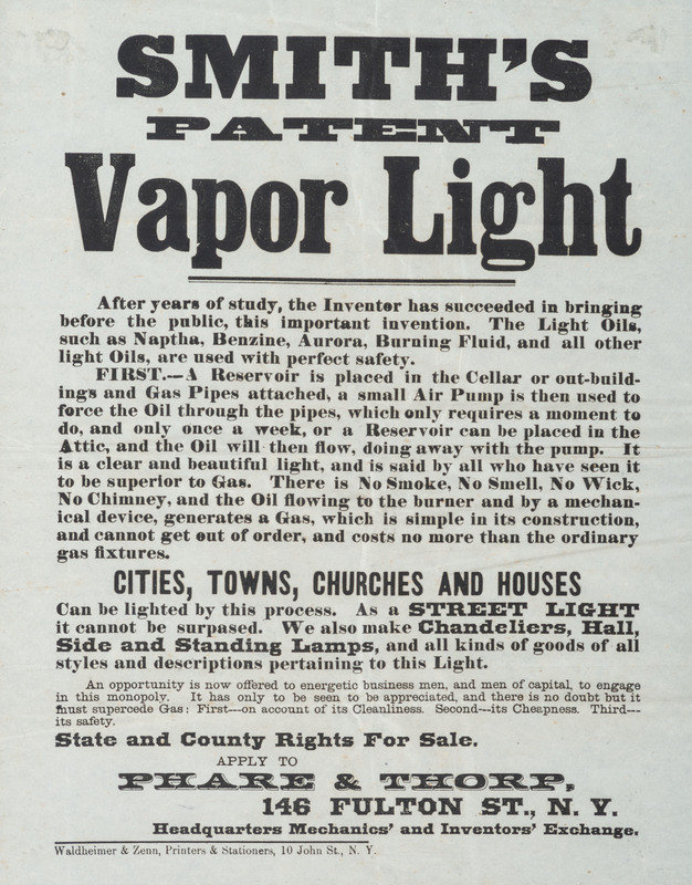 [With:] Smith's Patent Vapor Light. New York: Waldheimer & Zenn, n.d. 9 1/2 x 12 in. printed broadside (minor creasing) framed to 12 x 15 in. (not examined out of frame).