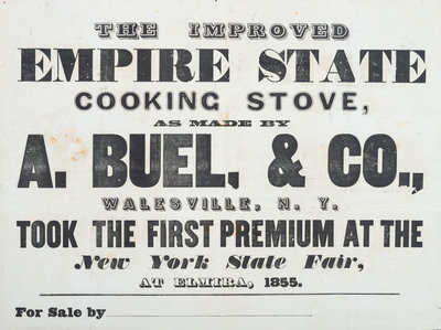 The Improved Empire State Cooking Stove, as Made by A. Buel & Co., Walesville, NY, Took the First Premium at the New York State Fair, at Elmira. Elmira, NY: N.p.,1855. 21 1/4 x 16 in. printed broadside (minor brown spotting, short marginal chips); framed to 26 1/2 x 20 1/2 in. (not examined out of frame.