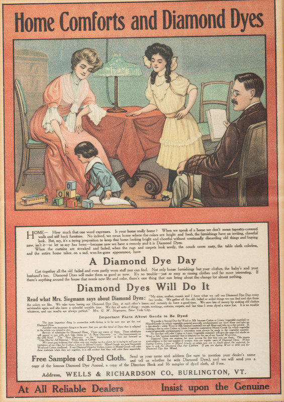 [Also with:] Home Comforts and Diamond Dyes. Burlington, VT: Wells & Richardson Co., n.d. Visible 9 5/8 x 13 3/4 in. color advertisement (minor toning, early soft fold); matted and framed to 15 x 19 1/4 in. (not examined out of frame).